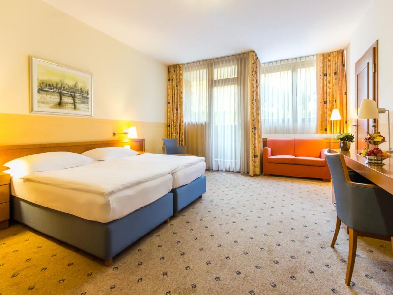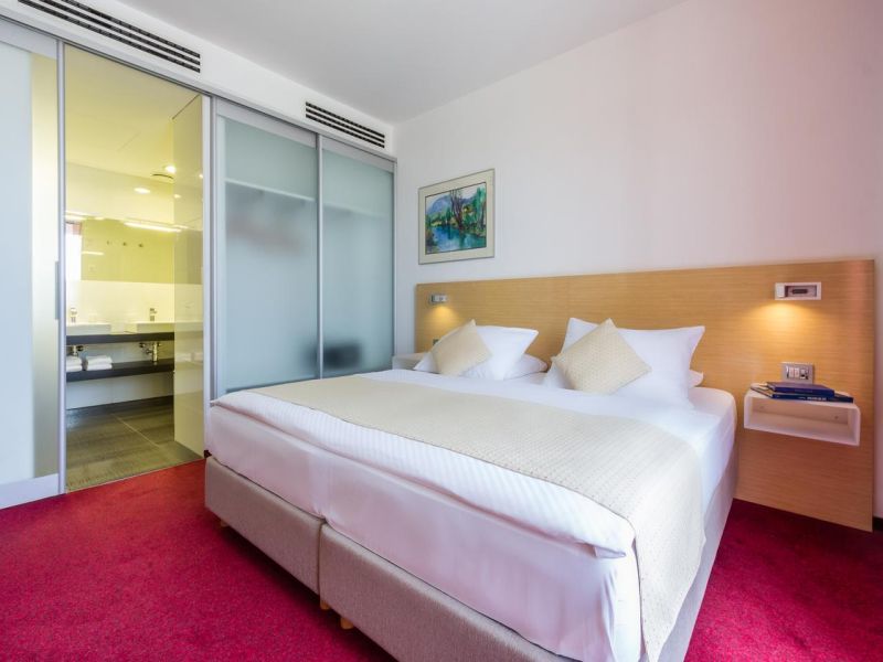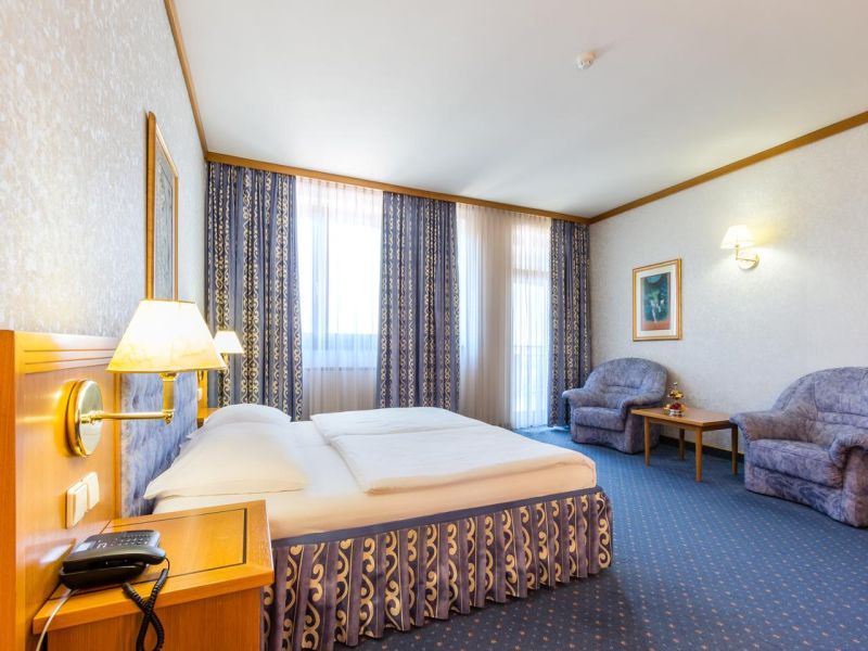 Апартамент: двухкомнатные номера; гостиная с диваном, креслами и журнальным столиком, спальня с французской кроватью, ванная, телевизор, мини-бар, телефон, кондиционер, сейф, фен, халат; балкон с видом на Марибор.