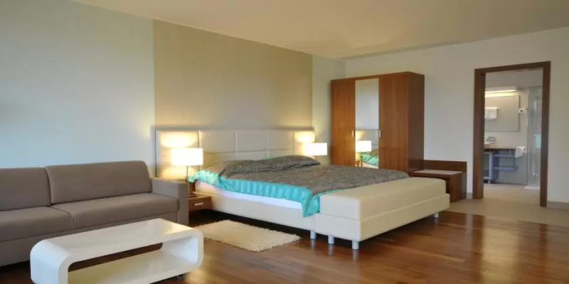 Junior Suite (45 м2)- зона спальни и зона отдыха с мягкой мебелью, балкон с видом на парк отеля, основные кровати - два матраса в одной раме.