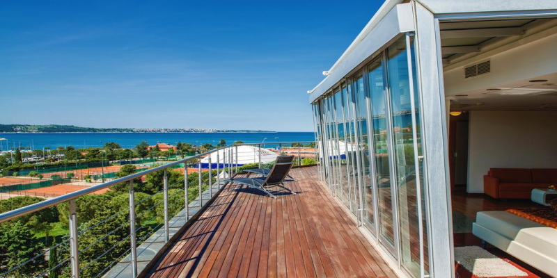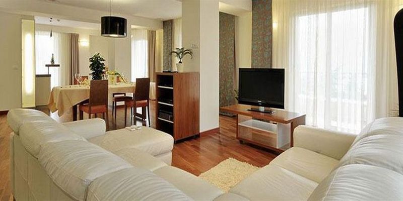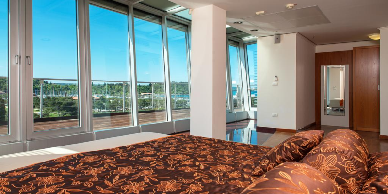 Presidential apartment - расположен на самом верхнем 5-м этаже, отдельная спальня с гардеробом и ванной комнатой, сауна, гостиная с диваном, большим столом, 8 стульями, кухня, терраса с видом на залив с джакузи и мебелью для отдыха.